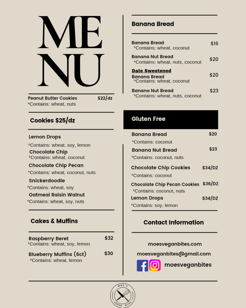 For order inquiries, please contact me via Instagram or Facebook. You can also email me at moesveganbites@gmail.com.